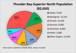 According to the 2016 Census, TBSN is home to 82,650 residents. Immigrants make up a sizable portion of the local population. For example, Italians at 12%, represent one of the largest ethnic groups among Northern Ontario districts. That translates to 9,925 constituents of Italian origin in TBSN alone.