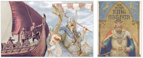 In the pics above: on the right, King Arthur, general of the post-Roman transition period, who tried to maintain civilization against the Anglo-Saxons and the Jutes who, in the image alongside, defend themselves against the Vikings half a millennium later (images from: www.thecollector.com and www.britannica.com)