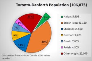 With a population of 106,875 residents, the riding is home to a number of culturally diverse ethnic groups including the Chinese and Greek communities. Italians make up 5% of the constituents in the district.
