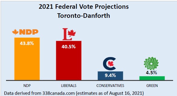 One of the better-known MPs to represent the area was NDP Jack Layton between 2004-2011. Historically, the riding has flipped between the NDP and Liberal party. According to the latest projections by 338Canada.com (August 16), which uses algorithms that take into account results of all major polls, the NDP are ahead of the Liberals by 3.3%.