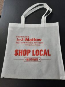 In the pics: the entrance to Fairbank Public School (note Matlow’s name well in sight and the bag offered by the Toronto councillor who did not miss the opportunity to promote himself)
