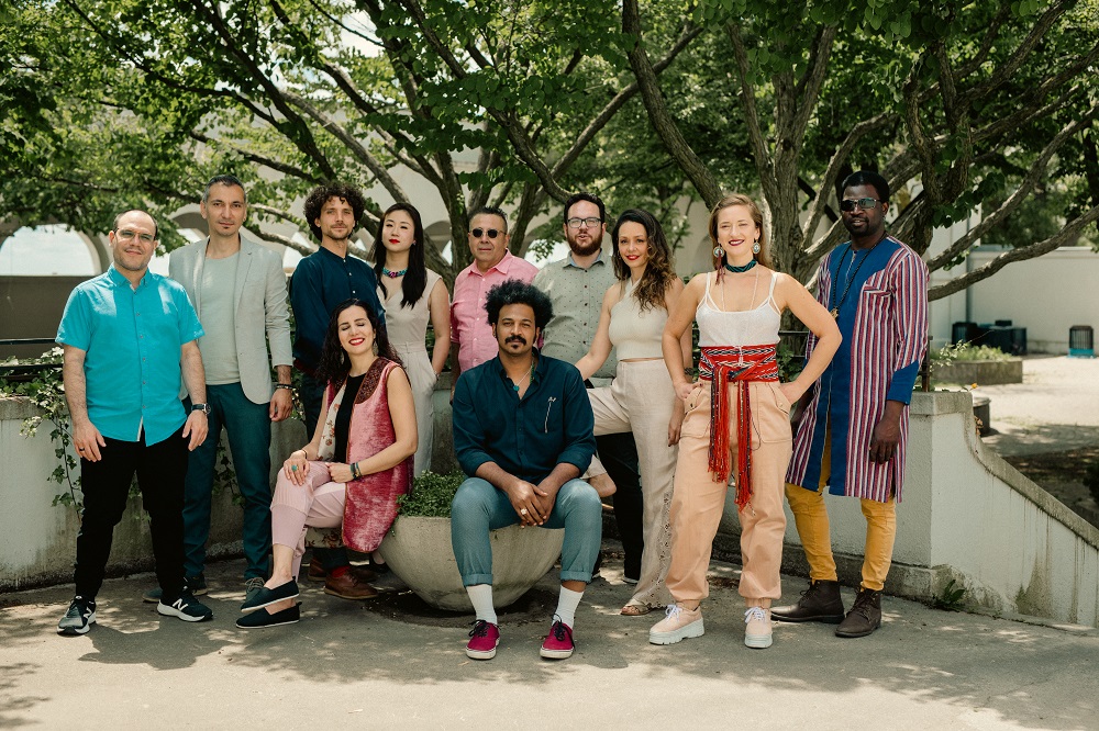 THE ORCHESTRA: Ahmed Moneka, darbuka, vocals – Iraq; Aline Morales, vocals, percussion, vocals – Brazil; Demetri Petsalakis, guitar & oud – Greece; Alyssa Delbaere-Sawchuk, violin – Canada; Dora Wang, dizi, xiao & alto flute – China; Salif “Lasso” Sanou, vocals, djembe, n’goni, peul flute & tama – Burkina Faso; Luis Deniz, alto saxophone – Cuba; Matias Recharte, drums & percussion – Peru; Paco Luviano, double bass & electric bass – Mexico; Padideh Ahrarnejad, tar – Iran; Selcuk Suna, vocals, clarinet & tenor saxophone – Turkey.