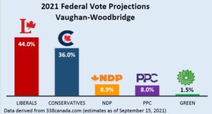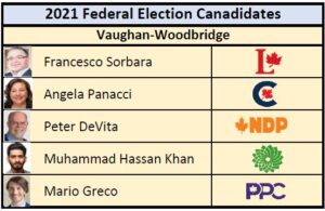 Francesco Sorbara, current MP, is seeking re-election for the Liberals. He has represented the riding since 2015 when he was supported by 48.9% of voters. In 2019, he was re-elected with 51.3% of the vote. The Conservative candidate, Teresa Kruze, took 36.3% of the vote, followed by the NDP candidate Peter DeVita at 7.8%.