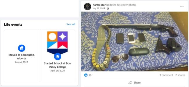 One of the “likes” on that post is from Karan Brar himself and takes you back to a profile from which it is clear that Brar began studying at Bow Valley College in Calgary on April 30, 2020 and moved to Edmonton (where he was arrested last week) on May 4, 2020. In that same profile, a few years earlier – on July 19, 2014, Brar himself posted a photo with a rifle, a gun and some ammunition: this is a post that, while we are writing, is still easily accessible, and it can be reached quickly by “scrolling” through Brar’s profile for just a few seconds (see the screenshot below).