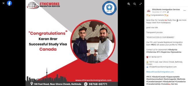 In the video (at the time of writing this article, it was available here, then it was removed but we have a copy of it, e.d.) Karan Brar states that he has requested a student visa through the immigration services of the company “EthicWorks ” in Bathinda, Punjab (also based in Canada). “And within a few days I received it” he said.