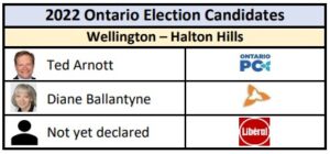 For the fifth time, Ted Arnott, the current MPP, is seeking re-election for the PC. He has represented the constituency since 2007. He was re-elected in 2018 with 54% support from the electorate (31,659 votes). His closest contender NDP candidate, Diane Ballantyne, took 24%, while the Liberals only managed 12%. The margin of victory was 17,572 votes.