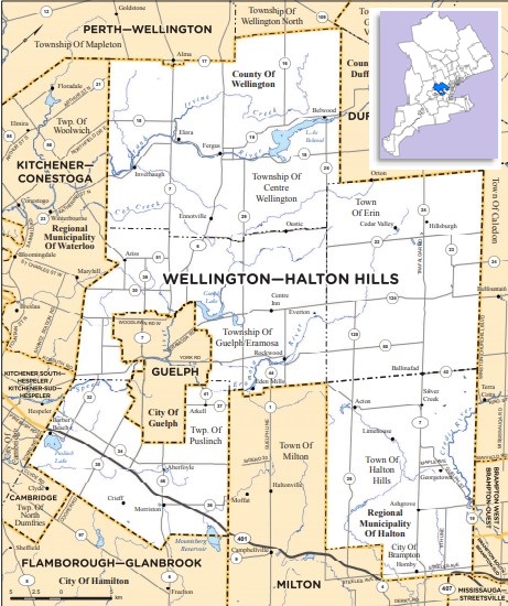 Wellington–Halton Hills spans a large area (1,584 km²) that surrounds the provincial electoral district of Guelph. Located in southwestern Ontario, the riding encompasses the towns of Halton Hills and Erin. It also includes the municipalities of Centre Wellington, Guelph/Eramosa and Puslinch.