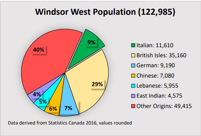 Windsor West is home to a vibrant population of 122,985 residents, many of which identify as first-generation immigrants to Canada. For instance, 11,610 constituents self-identify as Italian Canadian. They are among the largest groups originating from Europe at 9% of the district population.
