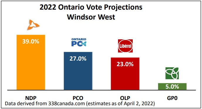 As things stand, it would appear a similar result may prevail. According the 338Canada.com (April 2), which uses algorithms that consider all major polls, the NDP, at 39% are ahead of the PC by twelve points. The Liberals, at 23%, trail the PC by four points.