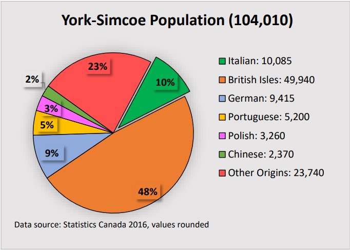 Some may refer to the area as part of cottage country, but it is becoming more of a commuter country. The area is home to a diverse and growing population with people originating from different ethnic backgrounds, primarily of British origin. In terms of residents with Italian heritage, Statistics Canada says 10,085 self-identify as Italian Canadian (as per the most recent data available, 2016 Census). That represents 10% of the district population.