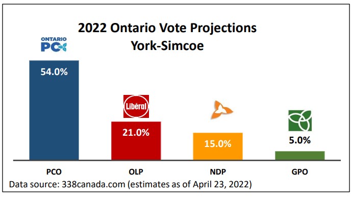With election day less than five weeks away, the majority of electors in York-Simcoe appear content with the current leadership. According to the latest projections by 338Canada.com (April 23), the PC are in the lead at 54%. The statistical model that uses algorithms and considers all major polls indicate that the Liberals trail by 33 points at 21%. The NDP hover around 15% followed by the Greens at 5%. (See graph at the top of the article)